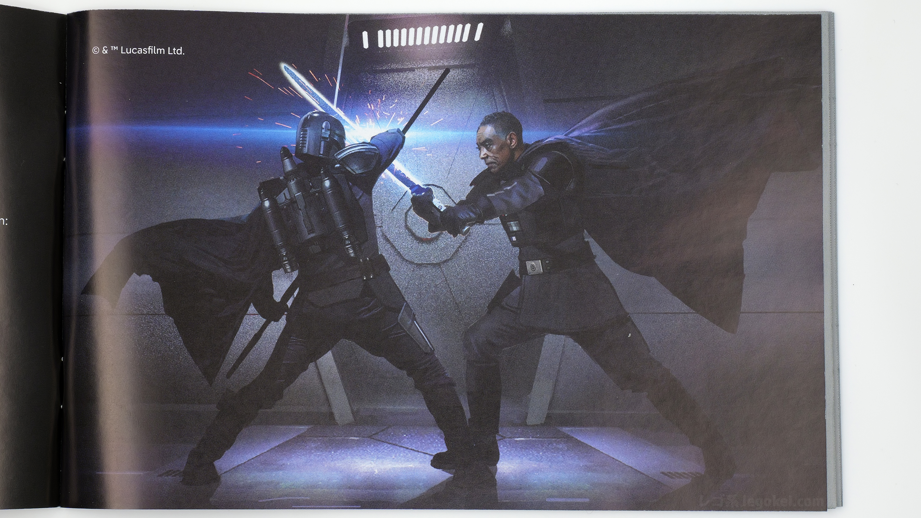 下のインストの画像のように、ダークセーバーのブレードは、形は円筒ではなく平らで刃先に向かってカーブ、色は中心は暗黒、縁は白く輝いています。