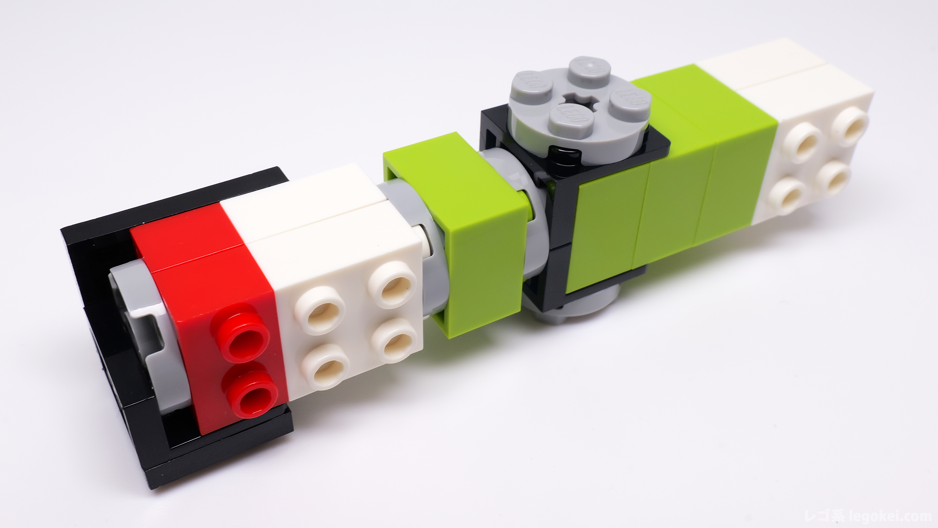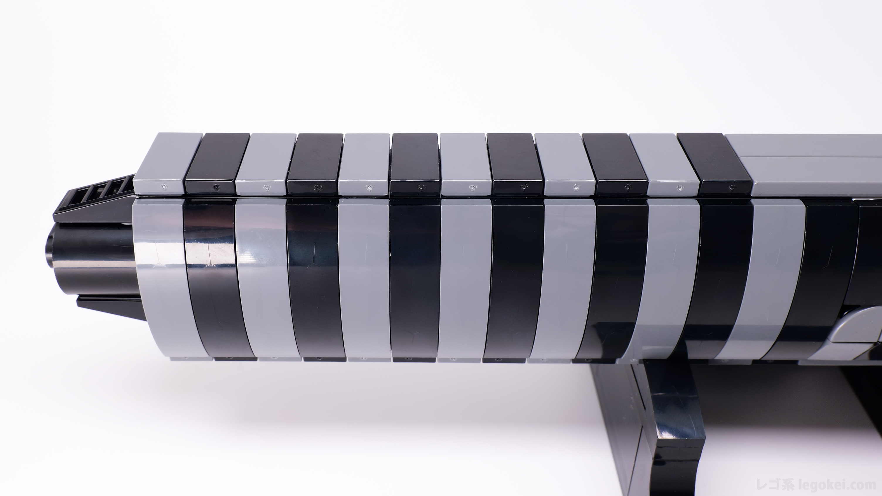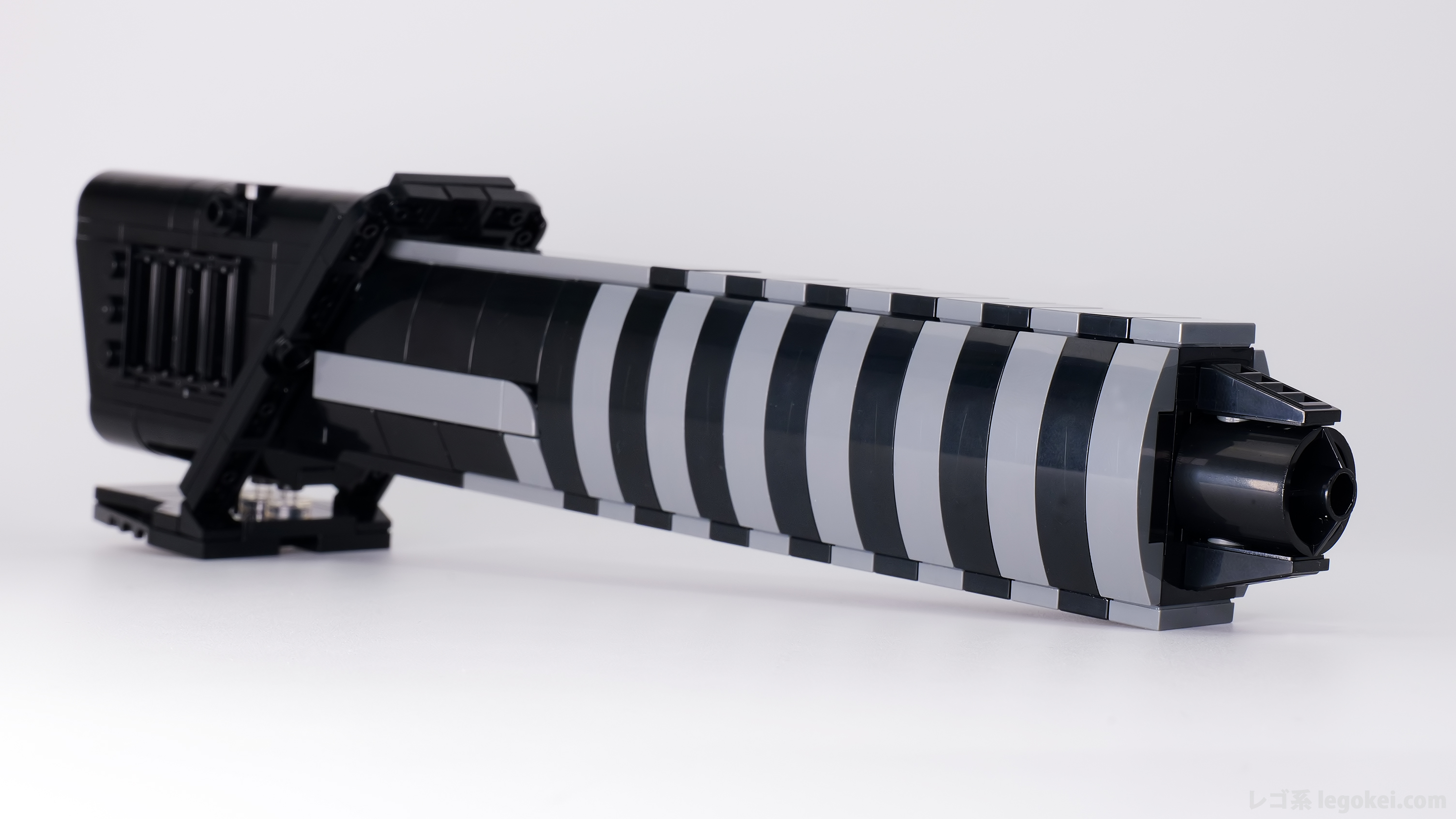 グリップ部分の上下のブラックとダークグレーの1×2タイルは、画像の通り、湯口が裏側になるよう揃えると、表から見ても裏から見ても統一感があり綺麗です。