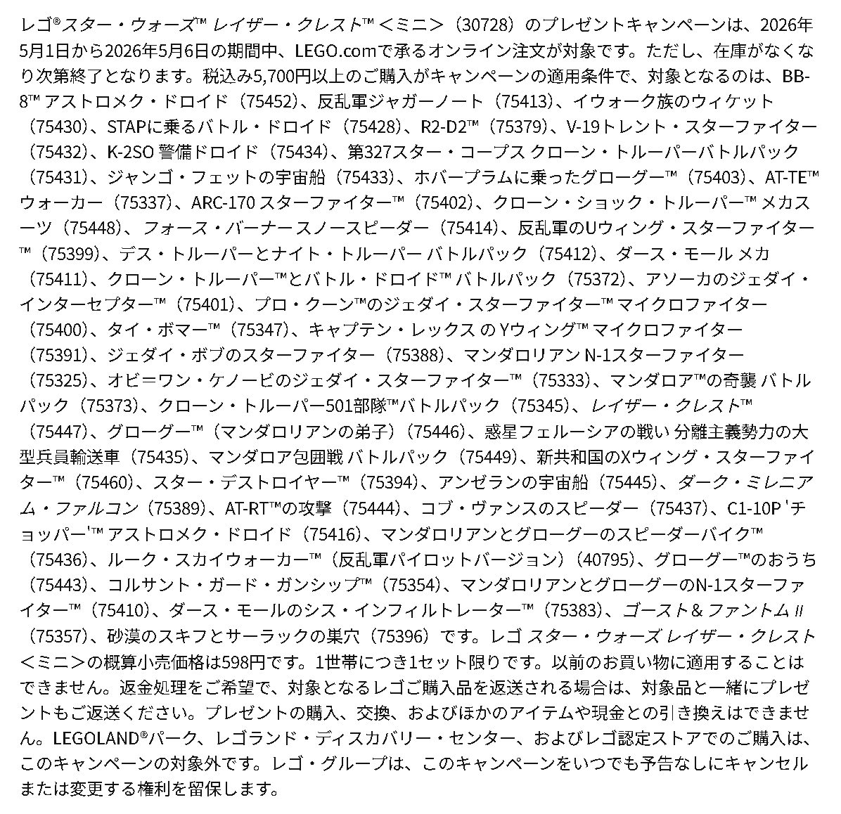 (「75442 マンダロリアン N-1スターファイター」はなぜか対象外… マンダロリアンなのに)