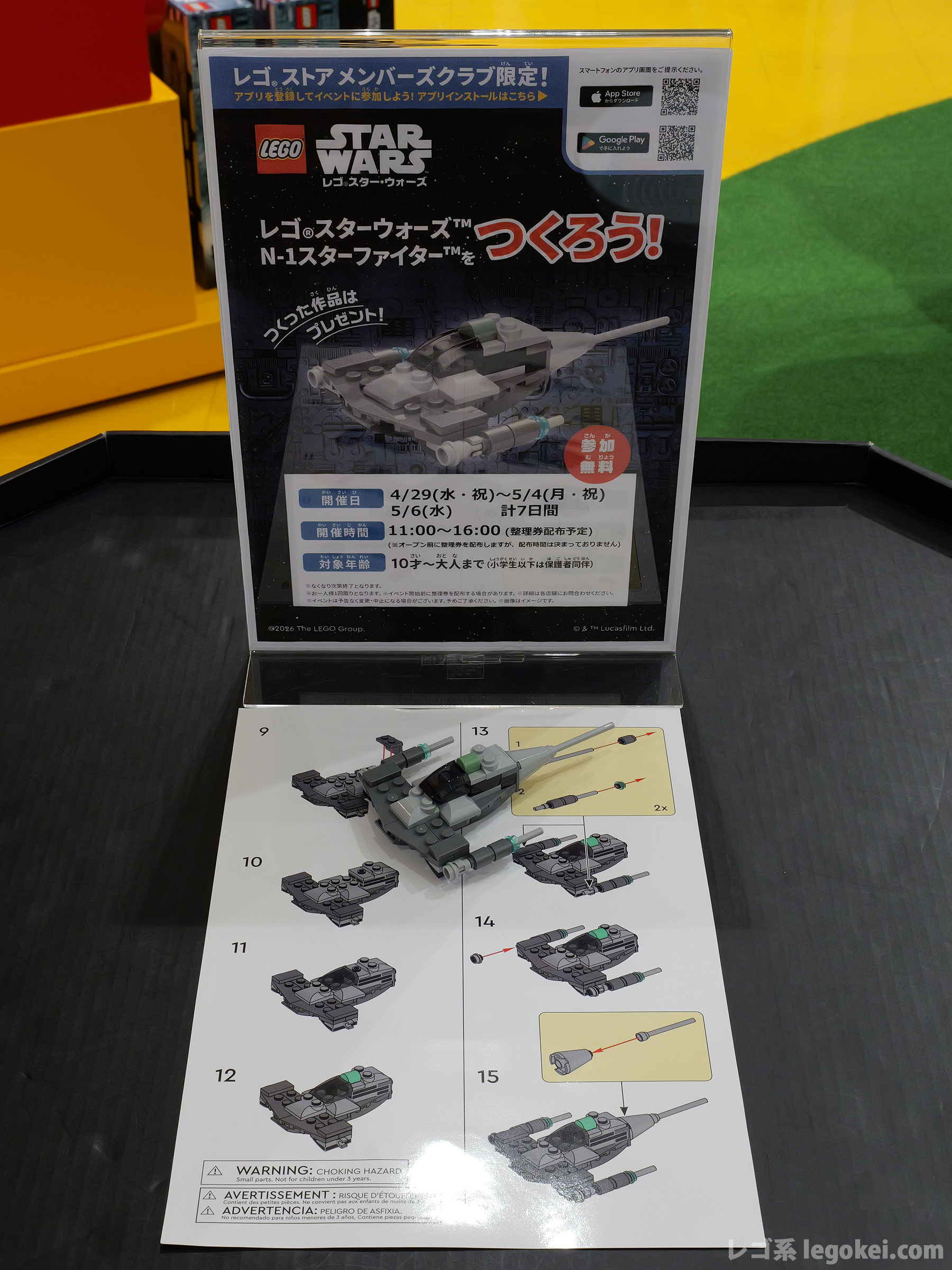 昨年のようなレゴ積分モデルの展示はありませんが、5/5(火)に、N-1スターファイターを組むワークショップが開催されます。